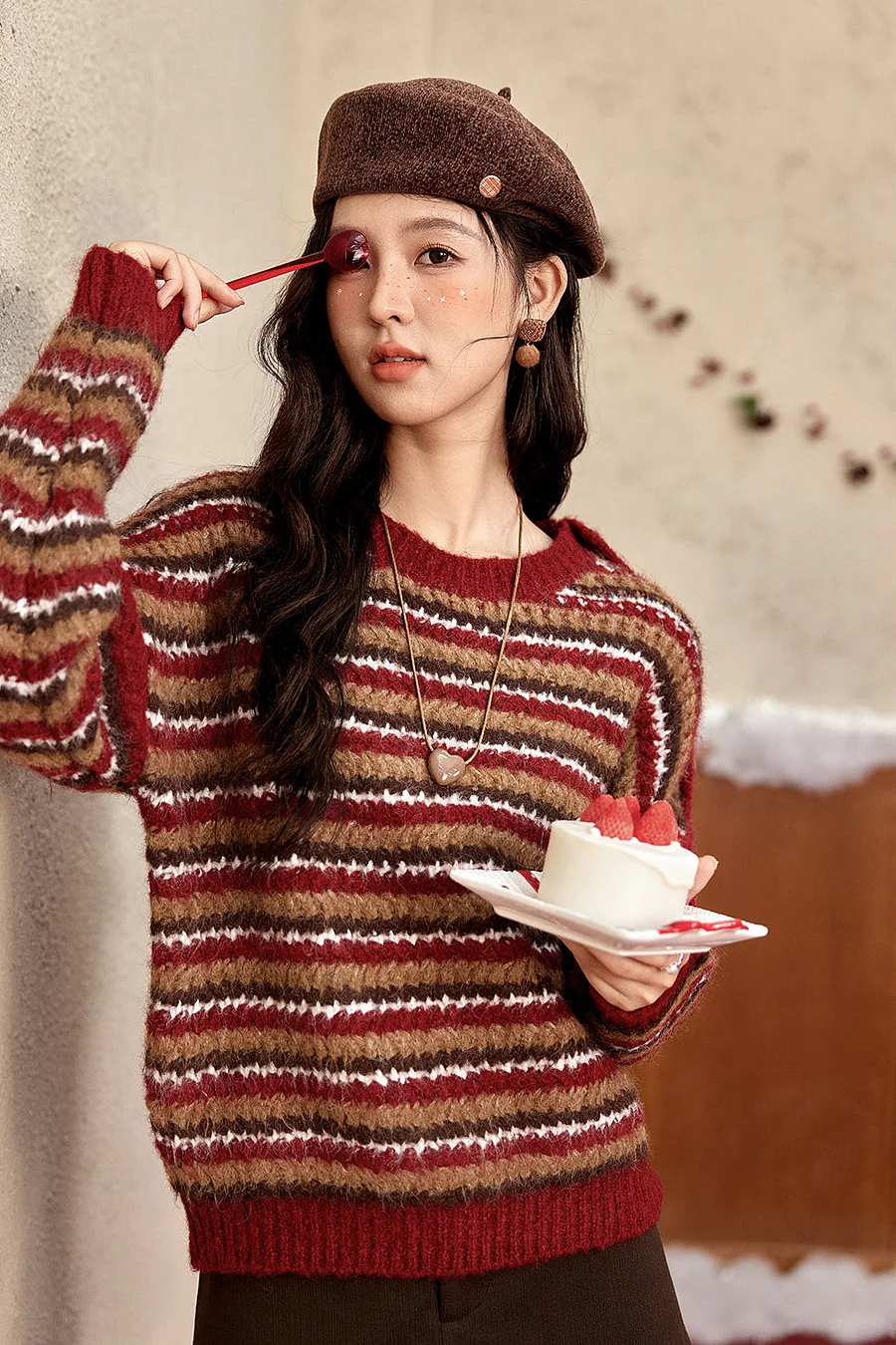 Warm caramel + wine-red stripes, woven into a fuzzy wool-blend sweater.Relaxed crew neck, drop shoulders (hides arm curves), ribbed cuffs for snuggly hands.Heathered threads = vintage film vibe.
