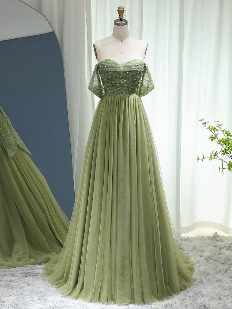 A-Line Off Shoulder Tulle Sequin Green Long Prom Dress, Green Long Formal Dress