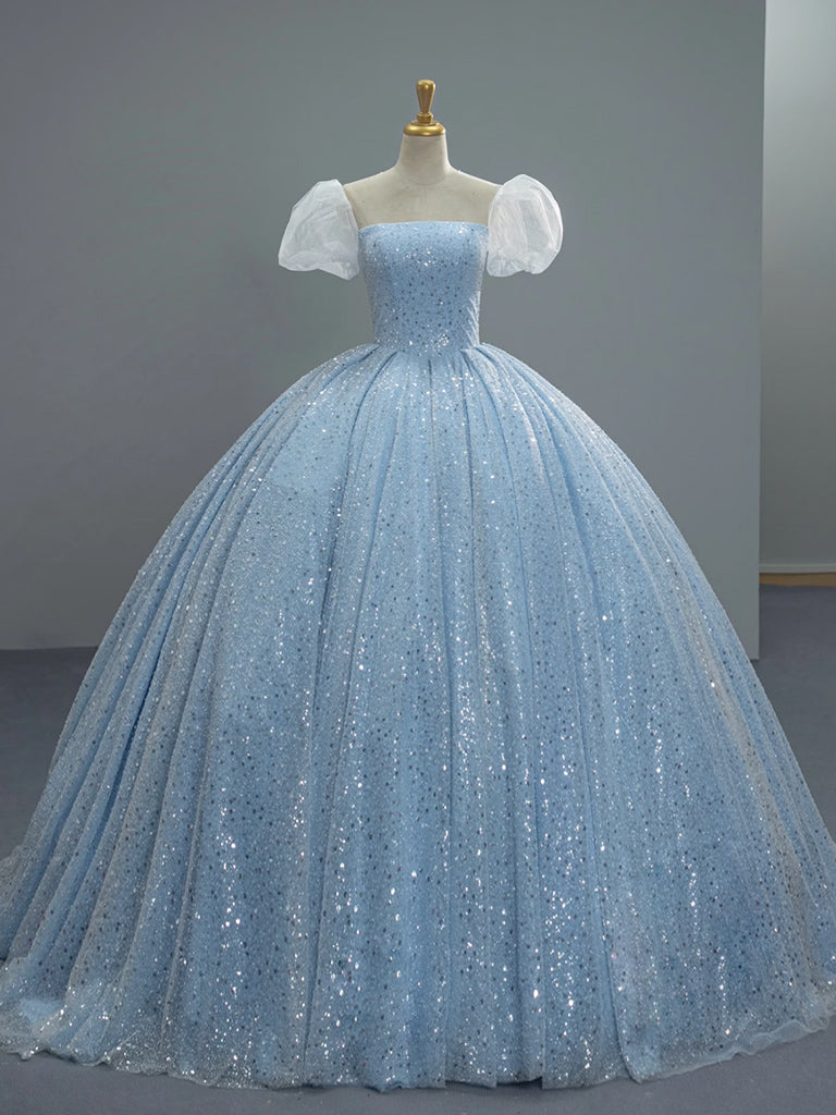 A-Line Puff Sleeves Tulle Sequin Blue Long Prom Dress, Blue Long Sweet 16 Dress