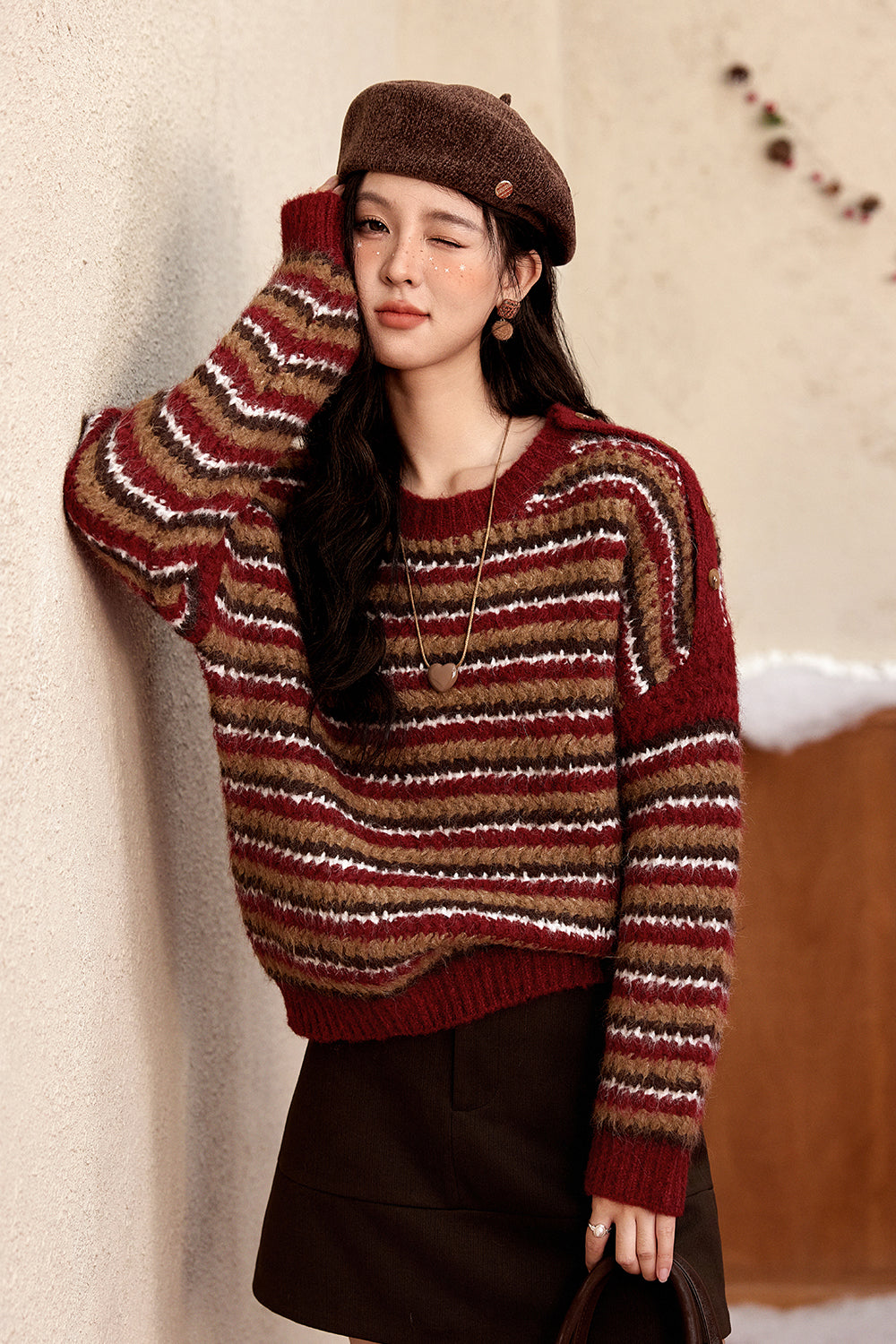 MISHOW Retro Striped Red-Brown Sweater | Soft Wool-Blend Lazy Knit Top for Fall & Winter